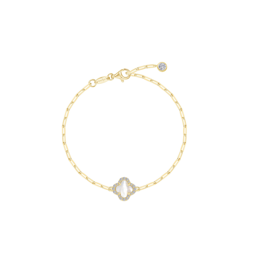Delicate and graceful. This bracelet features a cultured freshwater mother-of-pearl clover motif on a paperclip chain. Perfect for layering or wearing solo as a subtle statement. Set with Lafonn's signature Lassaire simulated diamonds in sterling silver plated with gold.