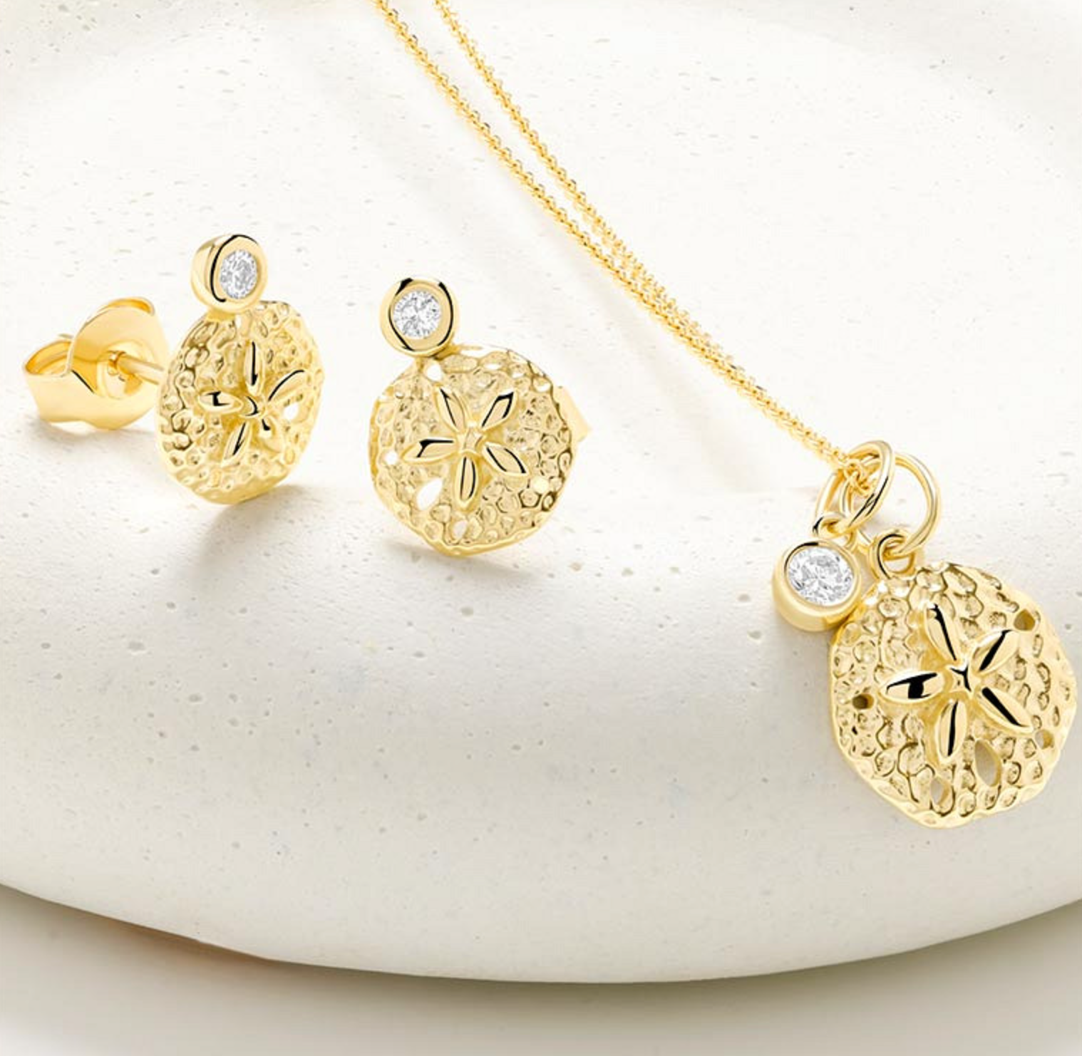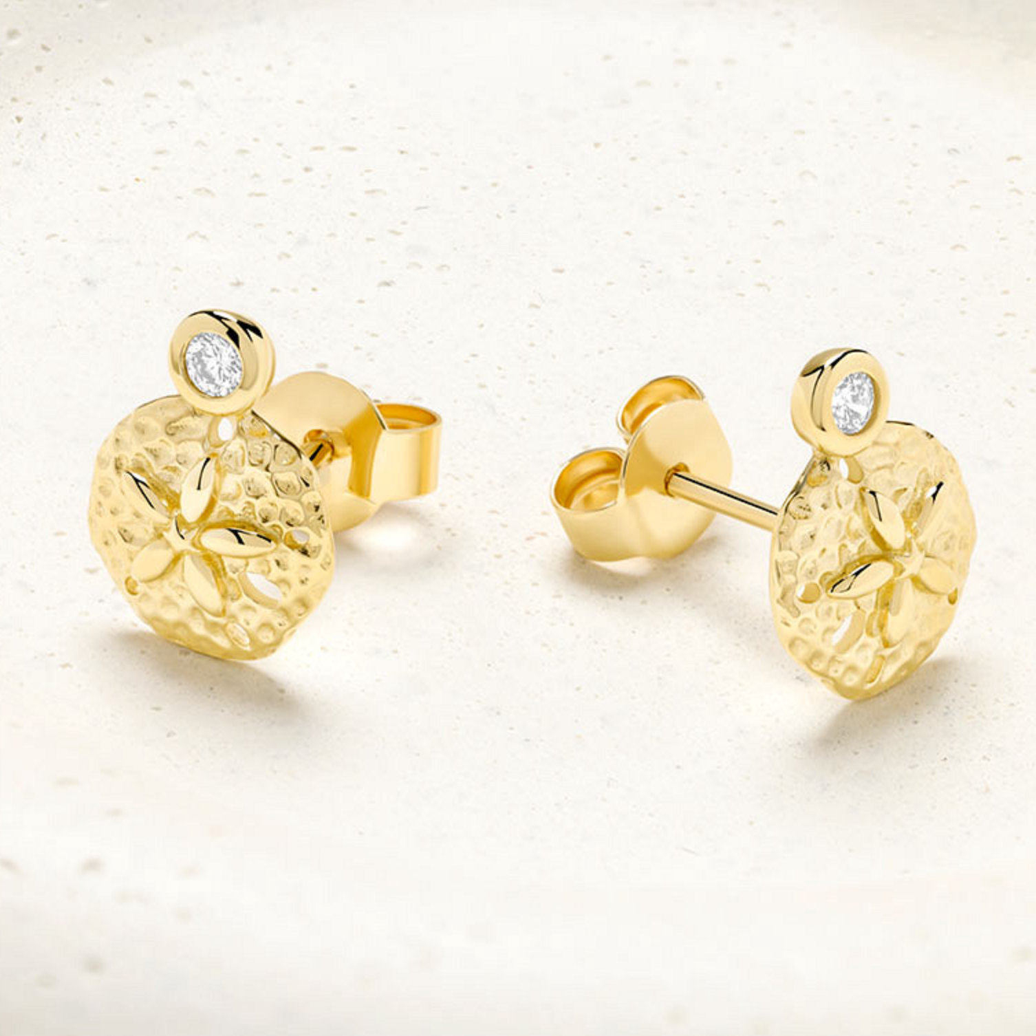 Miniature in size but rich in detail, these 14kt gold earrings are inspired by the natural beauty of sand dollars found along the shore. A finely textured surface adds depth and handcrafted feel, while a bezel-set lab-grown diamond introduces modern sparkle. Their polished, petite silhouette makes them a perfect everyday style or an elegant gifting piece.