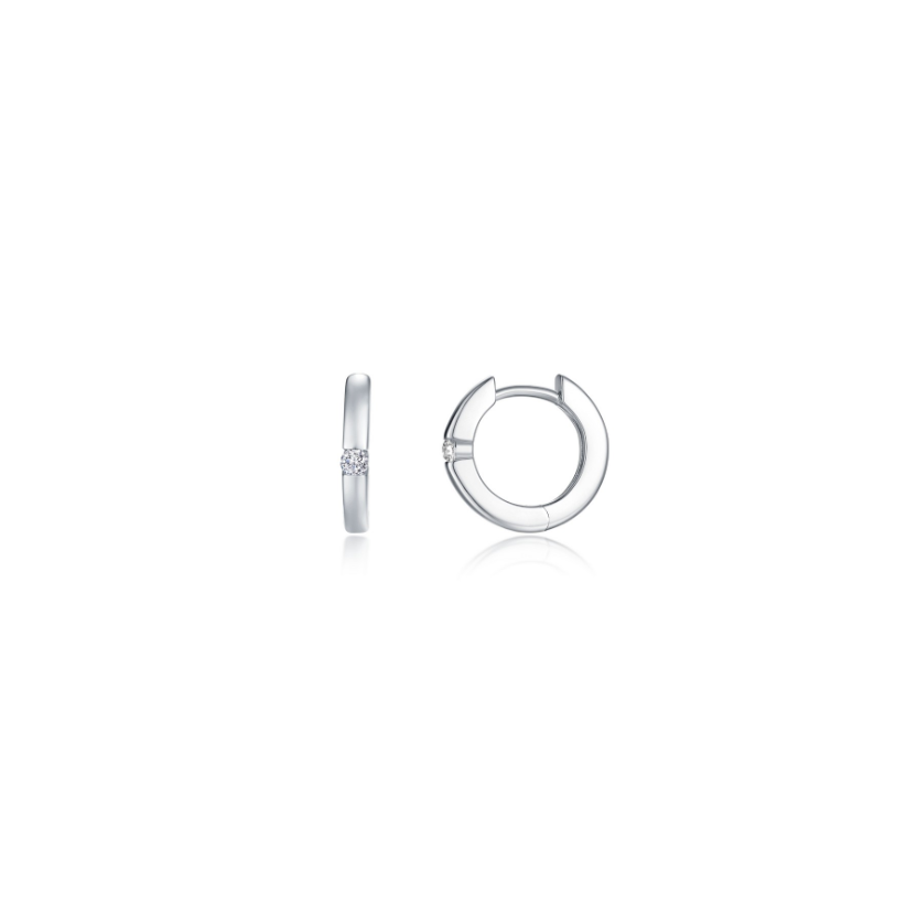 A modern take on minimalist huggies. A dazzling stone is delicately set at the heart of the hoop, catching the light with every turn. These earrings are perfect for stacking. Crafted in sterling silver bonded with platinum.