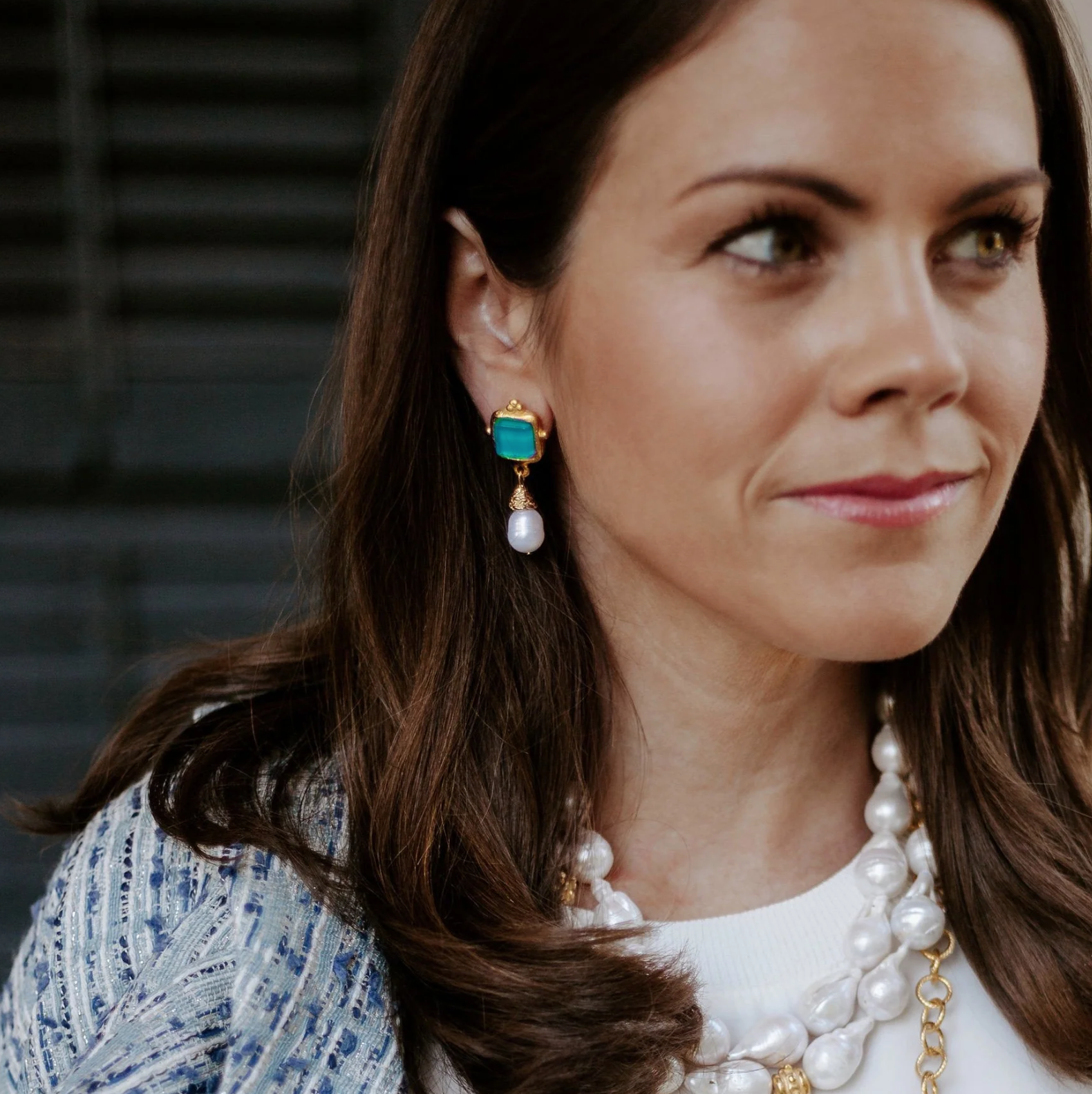 Charlotte Teal French Glass + Pearl Drop Earrings