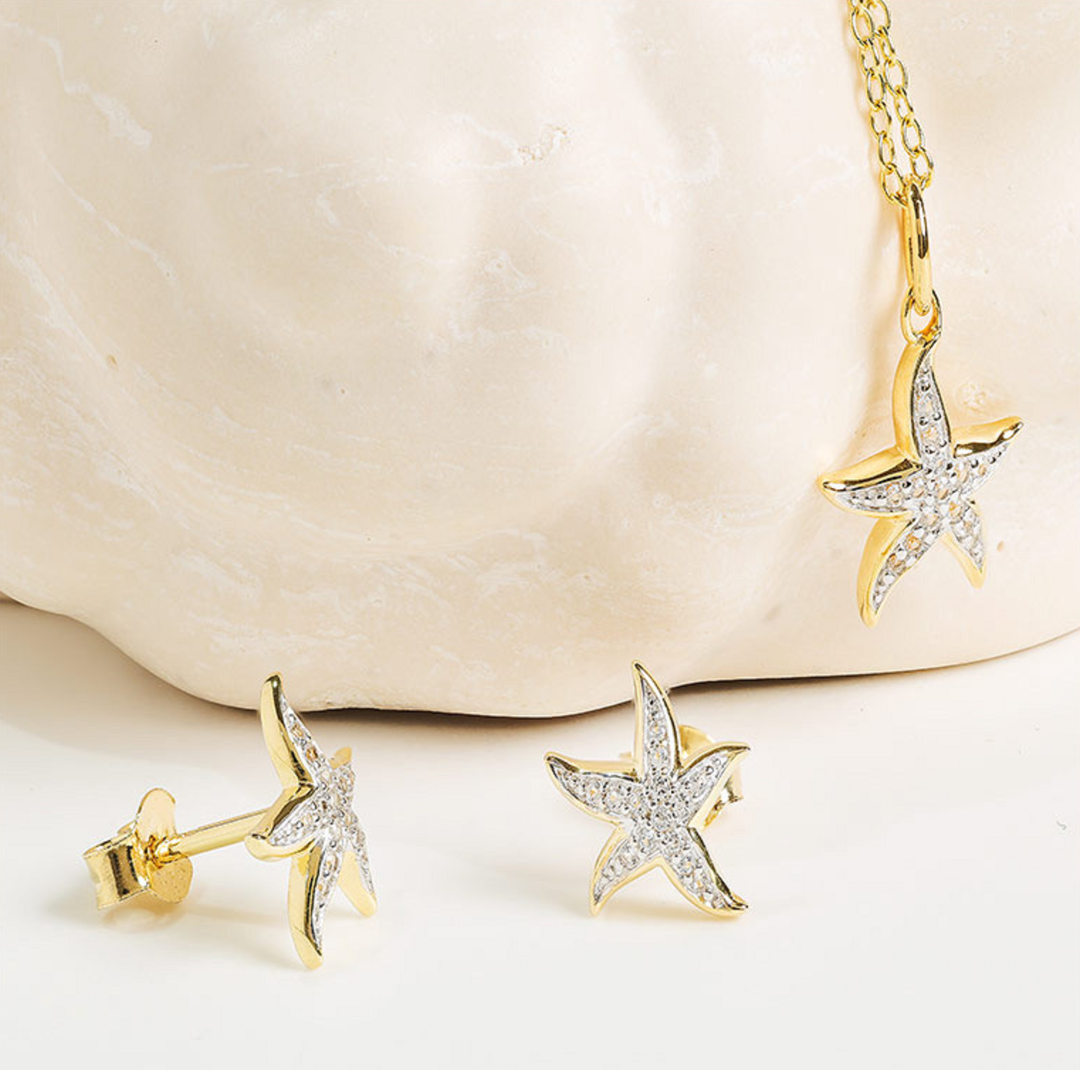 These starfish earrings shimmer like sunlight on the shoreline. Crafted in 14kt gold vermeil and adorned with white sapphires, they capture the delicate elegance of the ocean's most beloved symbol. The textured arms bring dimension and sparkle, evoking memories of beach walks and tide pool treasures.
