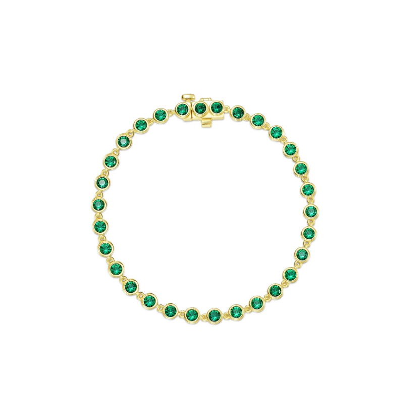 Grace in motion. This bracelet features a series of bezel-set stones, each elegantly linked to create a seamless strand of shimmering light. Set with simulated emeralds in sterling silver plated with gold.