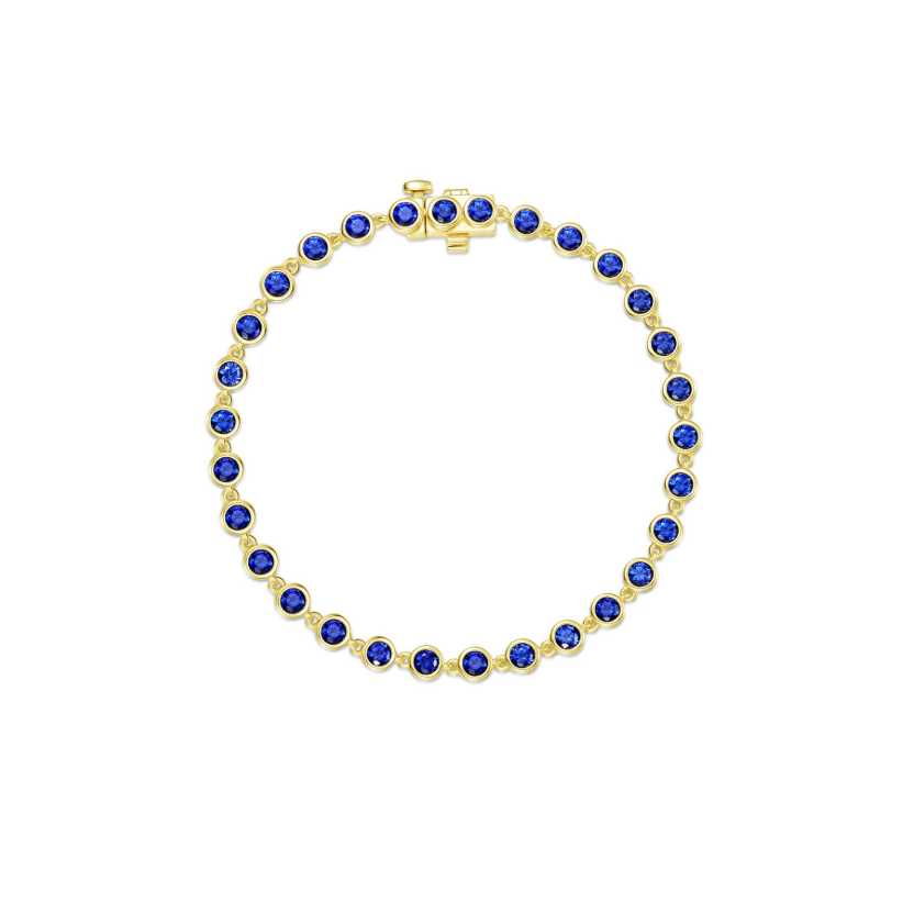 Grace in motion. This bracelet features a series of bezel-set stones, each elegantly linked to create a seamless strand of shimmering light. Set with lab-grown sapphires in sterling silver plated with gold.