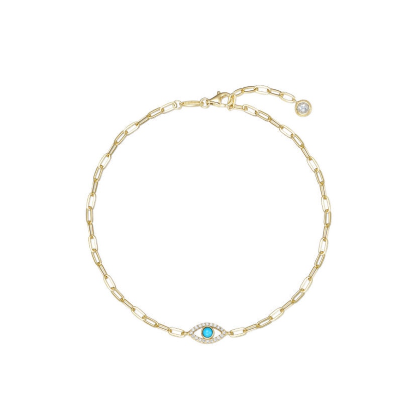 Featuring a delicate paperclip chain and a sparkling evil eye charm, this anklet adds a subtle pop of color and protection to any outfit. Adjustable in length and finished with a secure lobster clasp, it's a modern accessory with timeless significance. Set with Lafonn's signature Lassaire simulated diamonds in sterling silver and finished with Lafonn's exclusive TR Gold plating, a new and improved process that preserves the rich color of gold and enhances its brilliance.