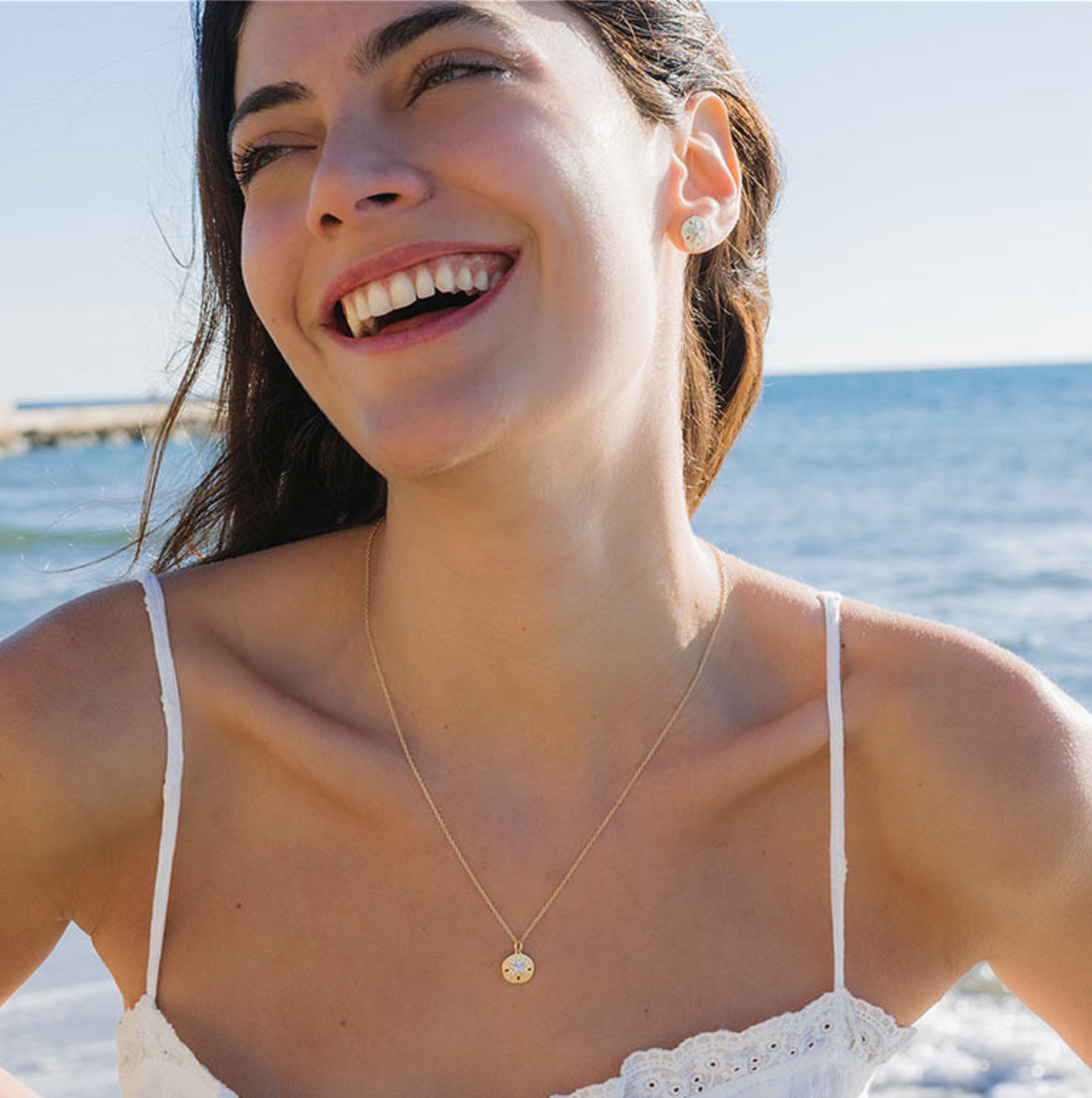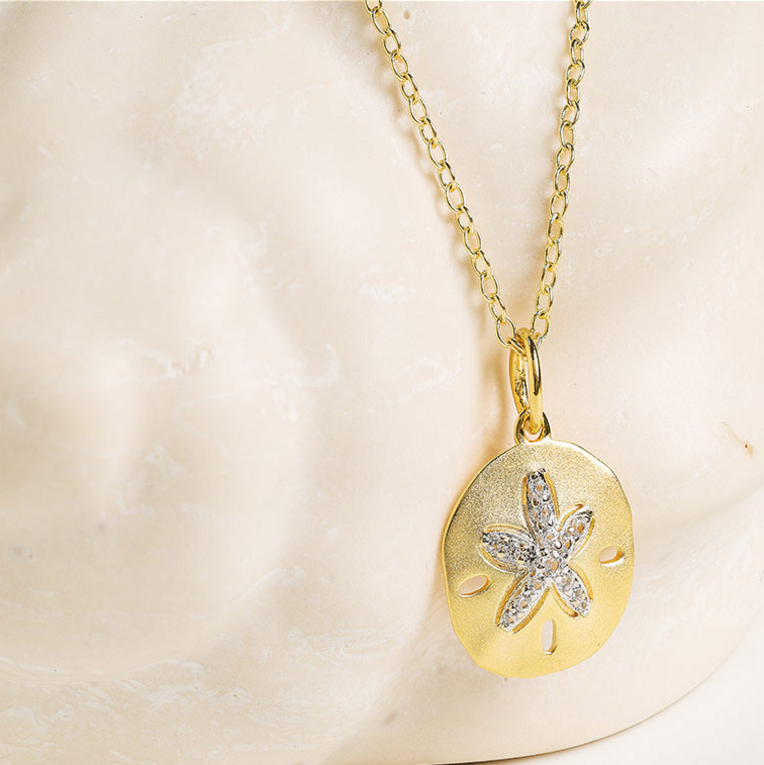 This 14kt gold vermeil necklace brings the charm of the ocean to life with its sand dollar pendant, finished in a soft matte texture for a natural, sun-washed look. At the center, white sapphires are pavé-set in a star-shaped pattern, adding a delicate shimmer. It hangs from a 20" adjustable cable chain with a lobster clasp and sliding ball, offering a secure and customizable fit. A meaningful piece inspired by beach treasures, ideal for gifting or completing a seaside story.