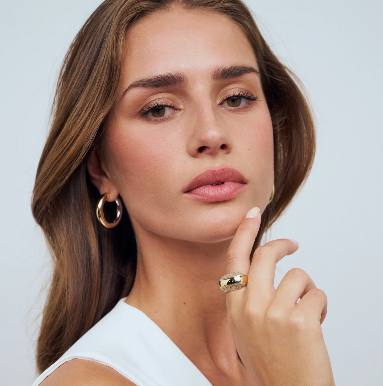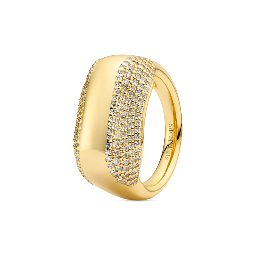 Ring made of 18k gold plated 925 Sterling Silver, a polished surface, and handset with facet cut white zirconia.