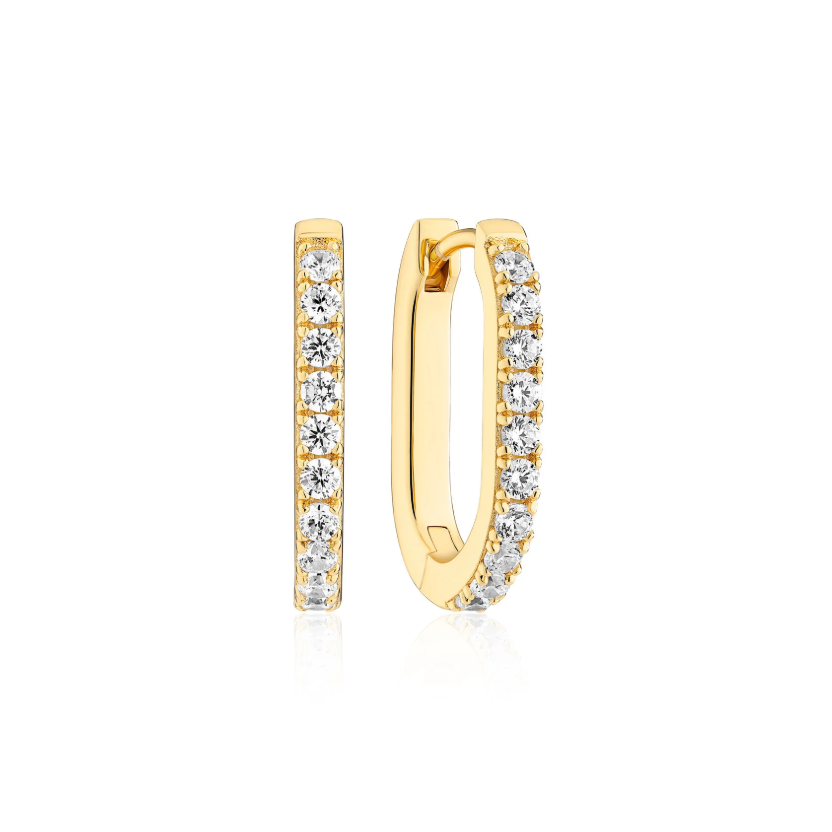 Earrings made of 18 karat gold plated 925 Sterling Silver, polished surface, and handset with facet cut white zirconia.
