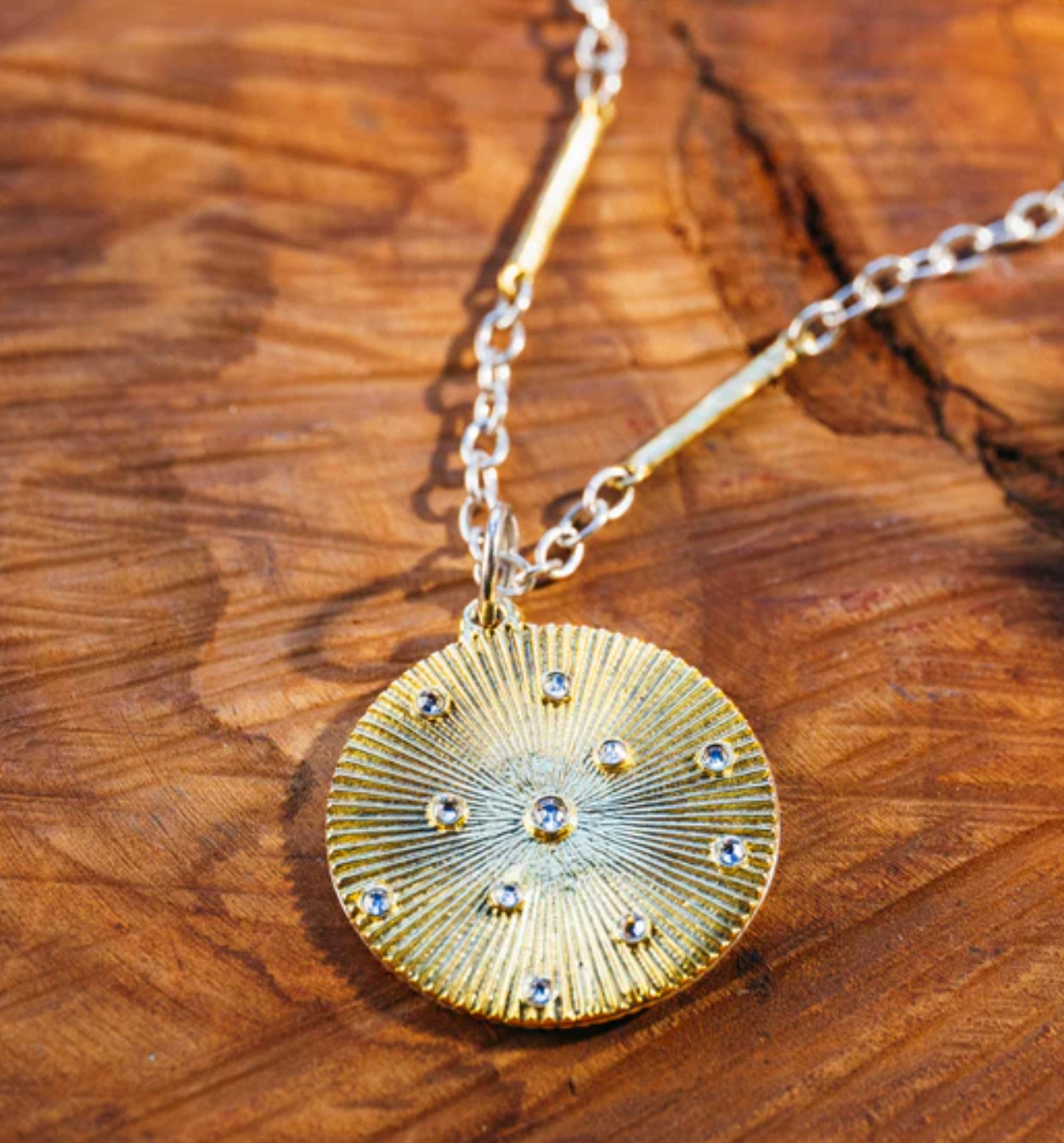Like an elegant disco ball that you get to wear and that symbolizes the Infinite, this piece is imbued with shimmering and gorgeous luminosity. The Eternal Light Pendant features hand wrought sunbeams etched on Brass and Sterling Silver, with points of Crystal Light. The Latin words Lux Perpetua (Eternal Light) are engraved on the reverse side.