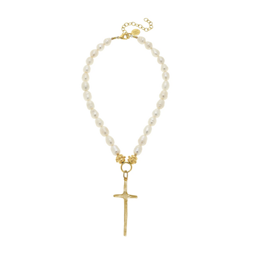Handcast Gold Long Cross/Freshwater Pearl Toggle Necklace