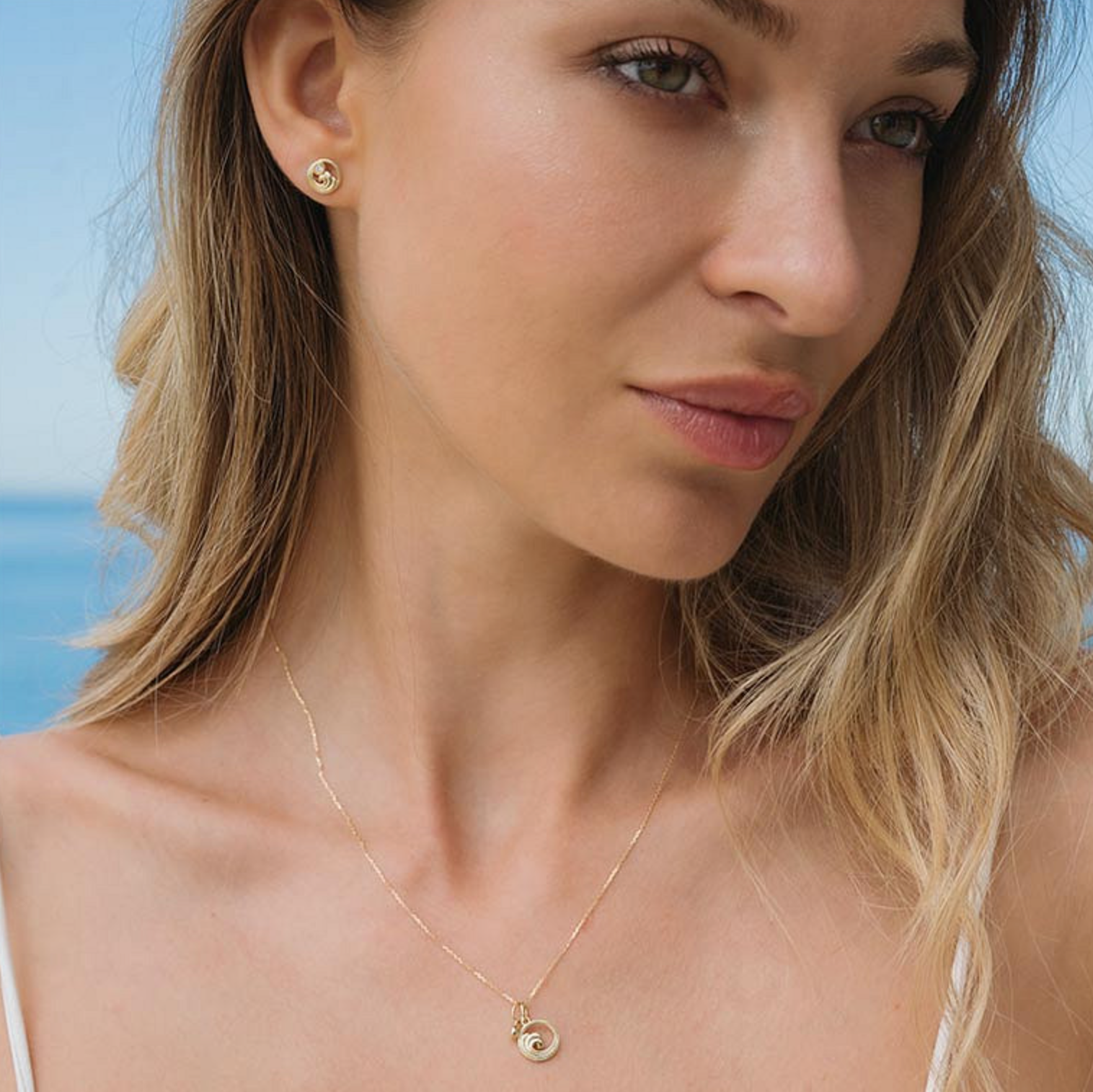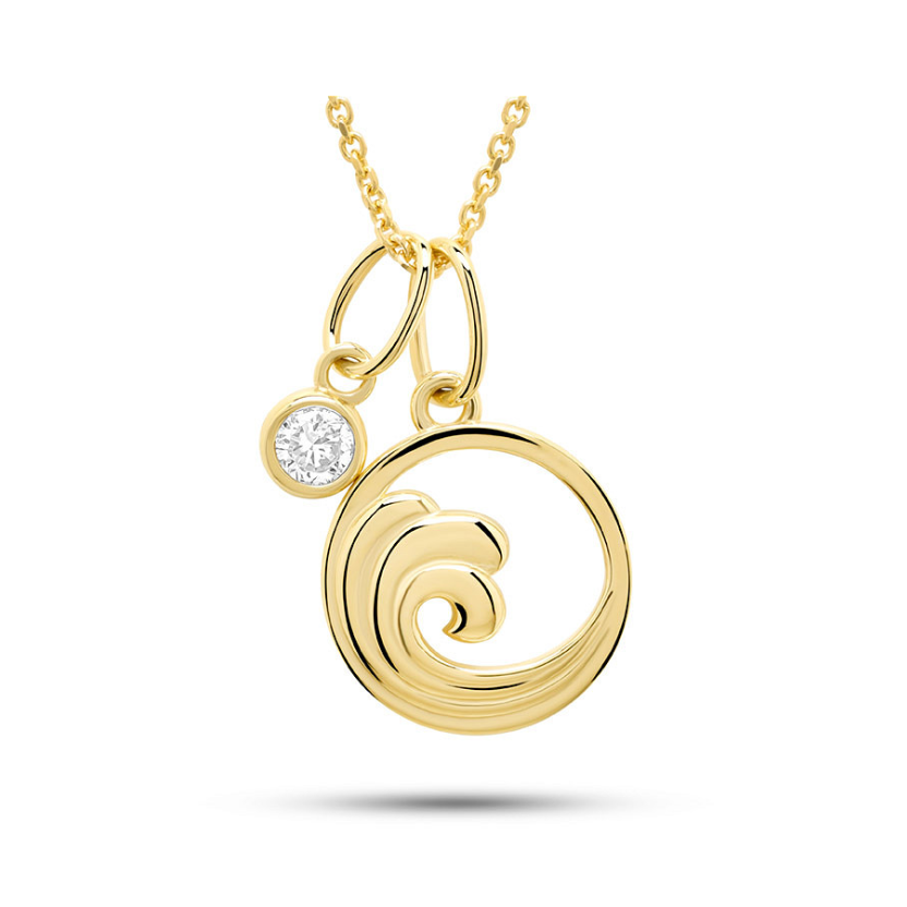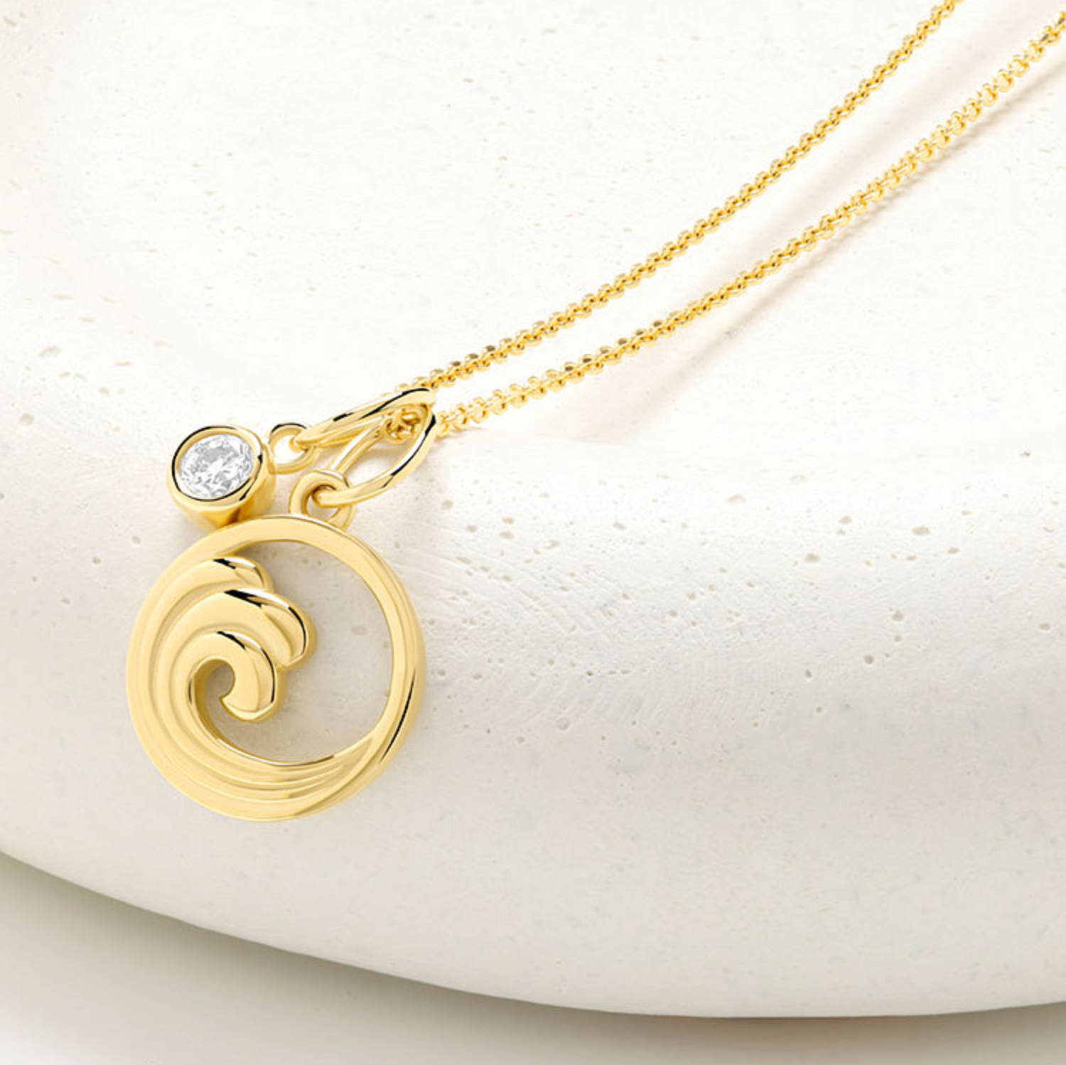 This 14kt gold necklace captures the following elegance of the sea with a sculptural wave charm, perfectly balanced by a lab-grown diamond in a bezel setting. Its fluid, circular design adds movement and modernity, while the petite scale ensures broad appeal across age groups and styles.