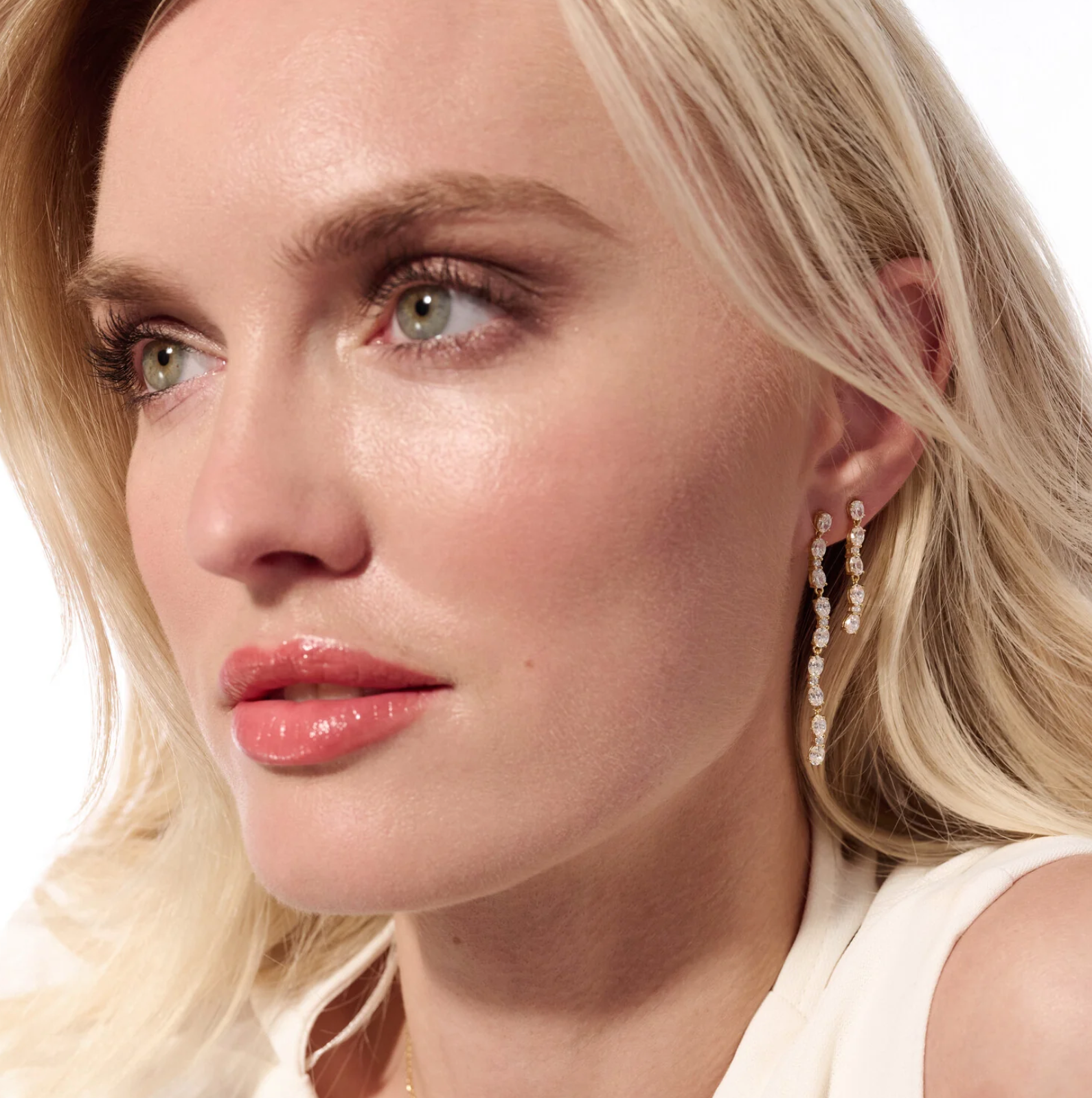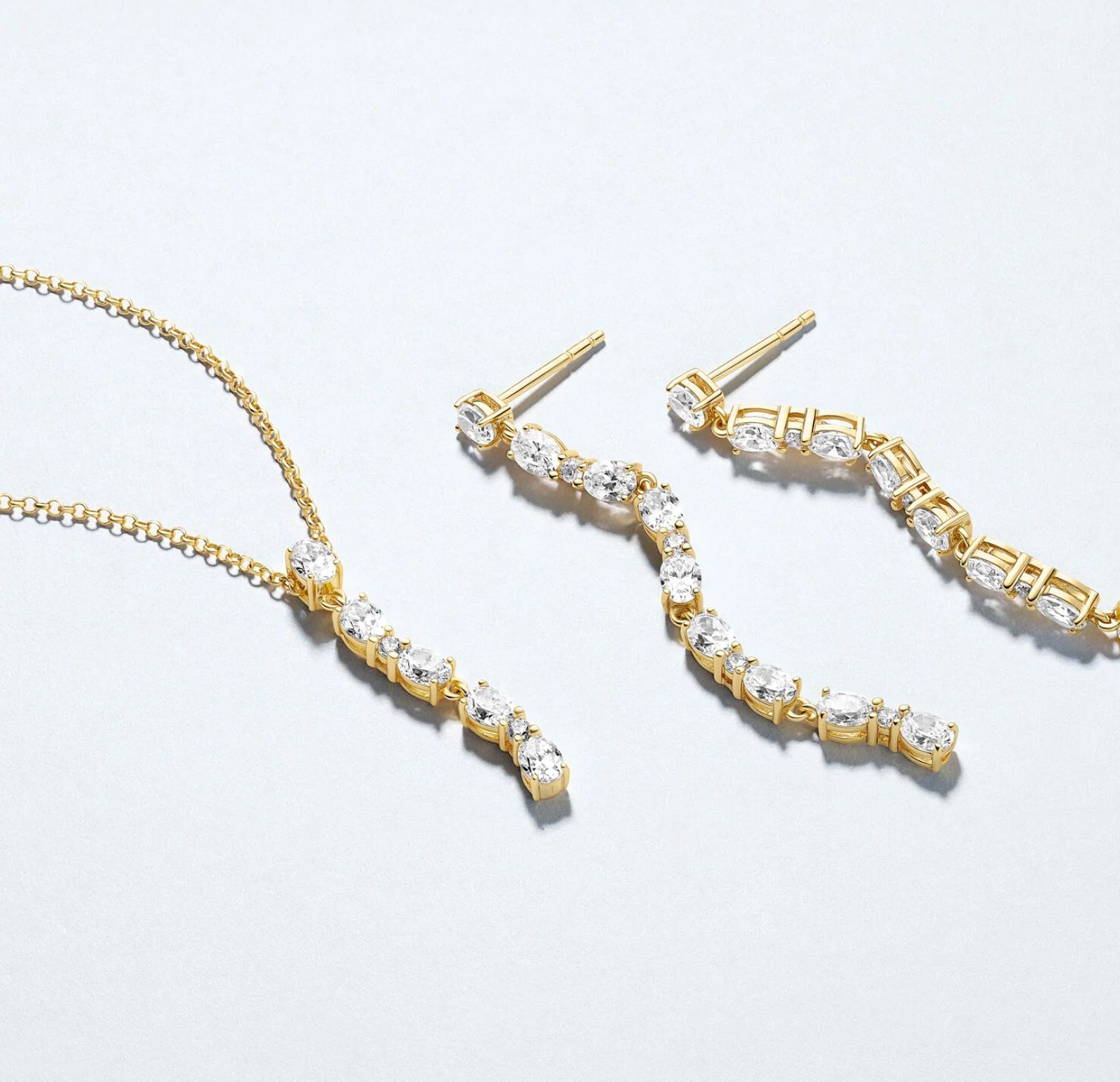 Earrings made of 18 karat gold plated 925 Sterling Silver, polished surface, and handset with facet cut white zirconia.