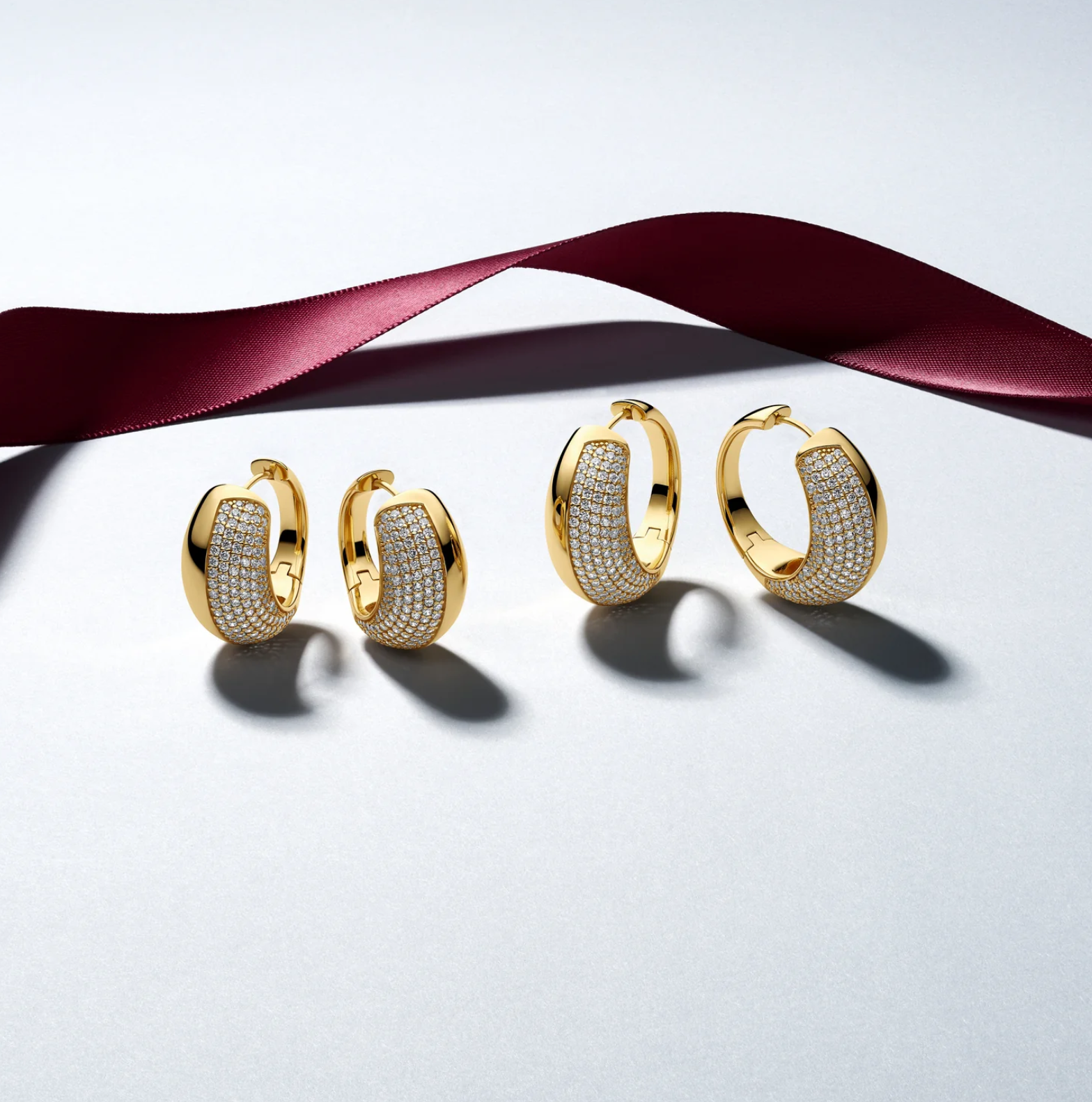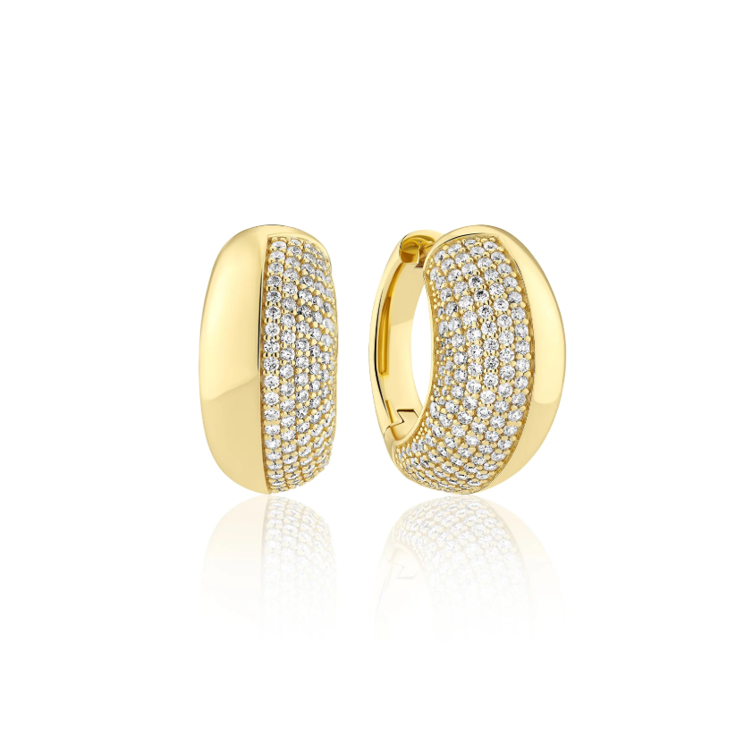 Earrings made of 18 karat gold plated  925 Sterling Silver, polished surface, and handset with facet cut white zirconia.