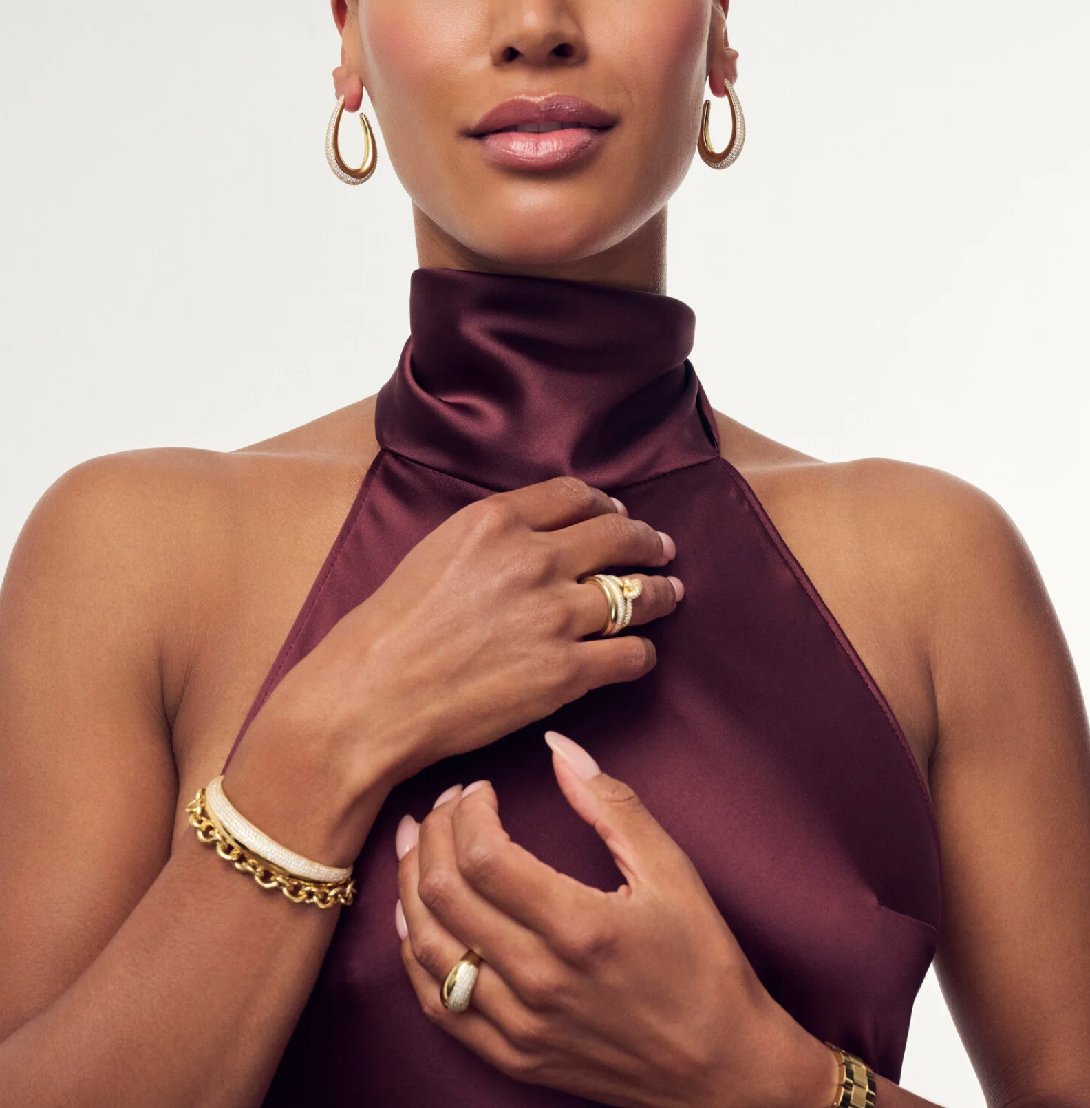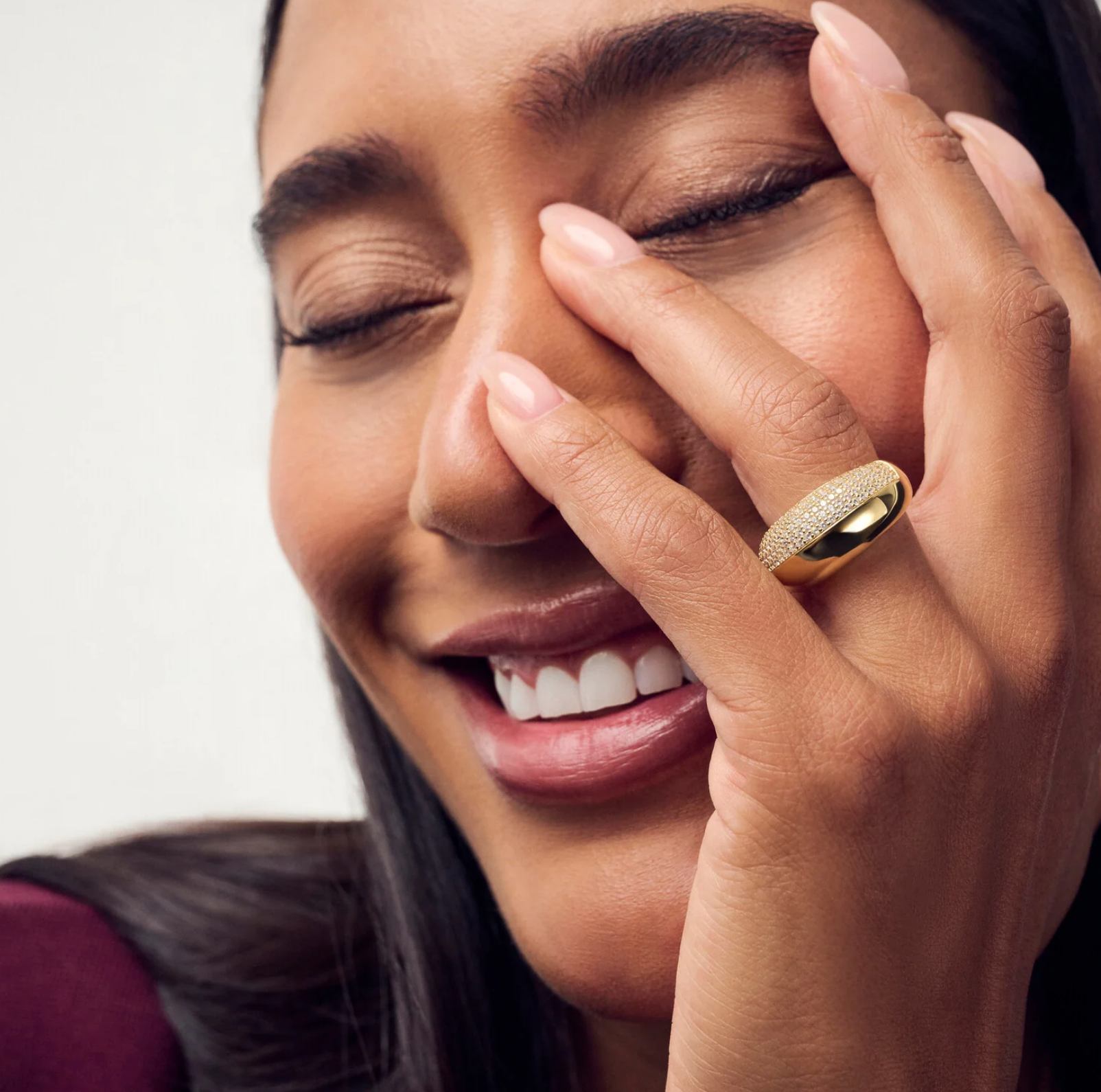 Ring made of 18 karat gold plated 925 Sterling Silver, polished surface, and handset with facet cut white zirconia.