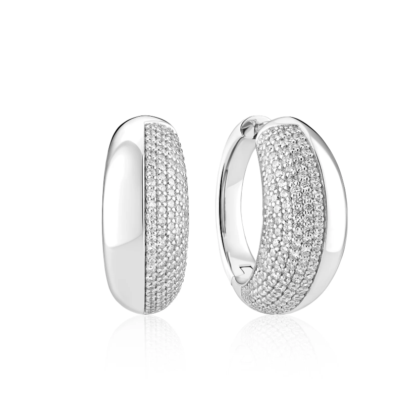 Earrings made of rhodium plated 925 Sterling Silver, polished surface, and handset with facet cut white zirconia.